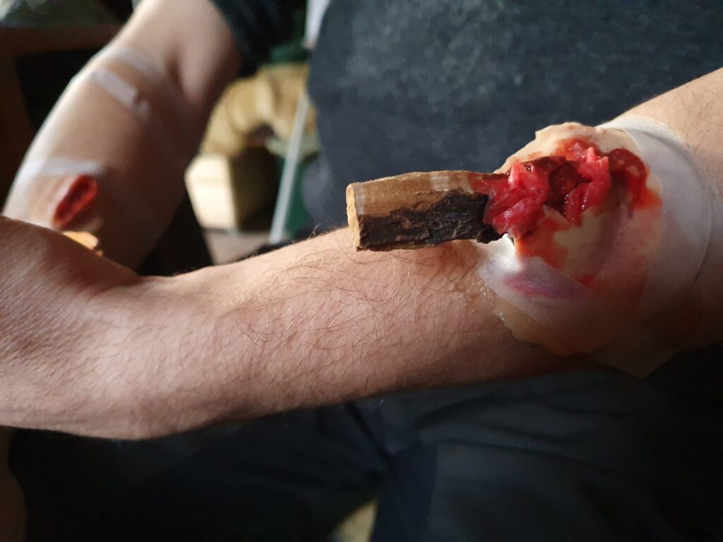 Übungen – begonnen haben wir mit Verbänden wickeln. Das klingt banal, doch die Übungen (auch blind, hinter dem Rücken an sich selber, im Dunklen, mit der schwachen Hand) haben gezeigt, dass gerade dieses so wichtige Wissen zur sauberen Wundversorgung, um Infektionen bis zur Sepsis bzw. das Verbluten zu vermeiden, alles, aber nicht banal ist! Verbluten ist nach schweren Unfällen immer noch eine der Haupttodesursachen. Dagegen können wir was machen, ebenso gegen die auch immer noch zu 10.000 den tödlichen Fälle der Sepsis als Folge einer infizierten, ggf. sehr kleinen Wunde. Aber wir müssen es wissen und immer wieder üben. So wie Sanis auch. Denn wir sind ja unser eigener Sani.