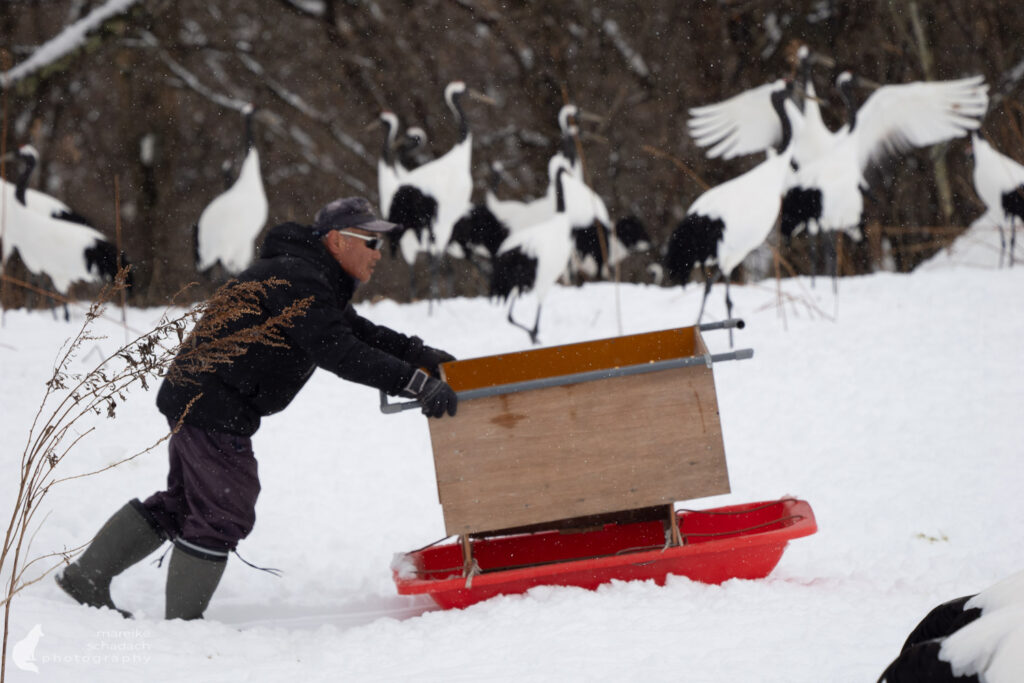 When I watch cranes in Germany, I have to be careful. Given their long flight distance, the birds would otherwise quickly disappear with their thunderous trumpeting calls. Here in Kushiro, everything is completely different. I rest my camera on the wooden railing and start taking pictures. The red-crowned cranes fill my entire camera frame—they’re that close. There’s a lot of activity in front of the barrier: people come and go, chat, and take pictures. Behind the barrier, the cranes are the picture of calm. Snow is falling lightly, and the cranes are searching the ground for corn kernels, which are scattered twice a day in winter. The birds have learned that people stay behind the barrier and that they are fed by certain people. Three different feeding stations have been set up in the Kushiro wetlands for this purpose.