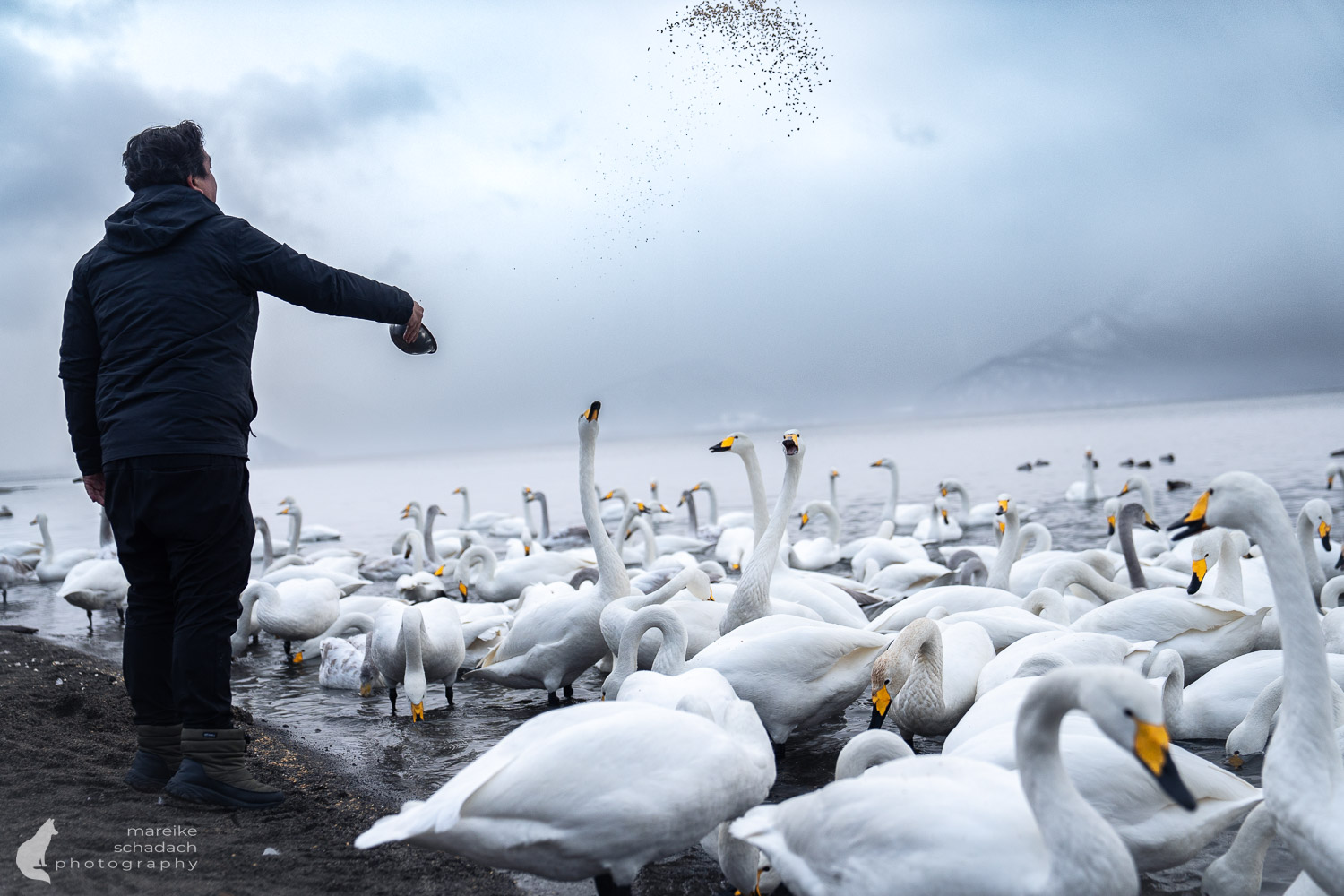 But after just a few meters, I spot a good two dozen birds, showing off their best side to a few weather-proofed observers. As I crouch behind a wall to shelter from the wind, the whooper swans stretch their long necks with full elegance, as if the weather doesn’t affect them at all. It soon becomes clear to me why so many birds gather here. It’s not just the warm water from the hot springs that keeps this section of Sunayu Onsen ice-free, but also the winter feeding that makes the eastern shore of Lake Kussharo so popular. Grain feed is scattered with large spoons, and the swans swimming farther away hurry over so they don’t miss out. In the midst of the spectacle, the sky clears a bit, and the mountains on the opposite shore of the lake provide a striking contrast to the swans’ white plumage.