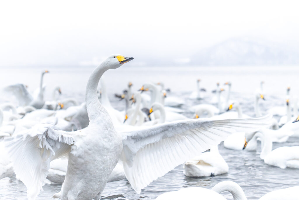 On the way to Lake Kussharo, winter is relentless, and we cross the Bihoro Pass with the utmost caution. Upon arriving in Kusshar, the roads were deeply snow-covered, but our car takes us to the lake without difficulty. Snow and a biting wind sweep across the shore. I get my camera ready, slip it into a waterproof bag, and venture out. Will the swans even be here in this weather?
