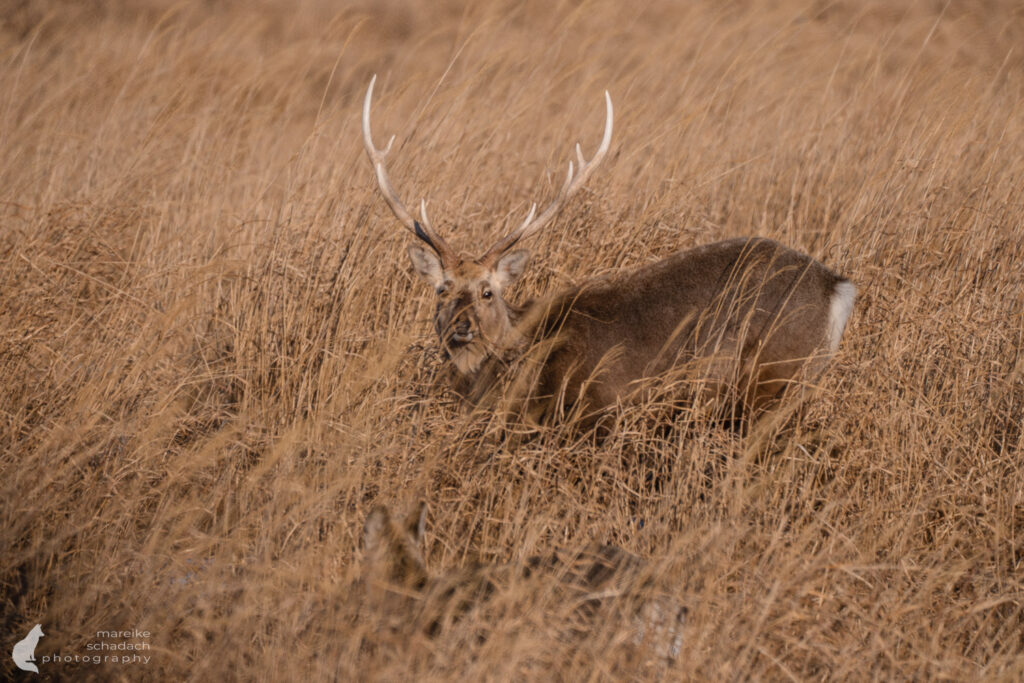 As I stand on the narrow spit of land that is the Notsuke Peninsula, an icy wind blows in from the sea. Even on the approach road, I spot the first animals by the roadside, grazing calmly in the dry grass. Then I come across a larger group standing near the fishing gear and boats, right by the roadside. The deer seem accustomed to the presence of humans; they lift their heads, fix me briefly with alert eyes, and then return to feeding or playful sparring. It is particularly impressive to see them moving in small groups through the snow-covered, barren landscape, seemingly perfectly adapted to the harsh conditions of winter.