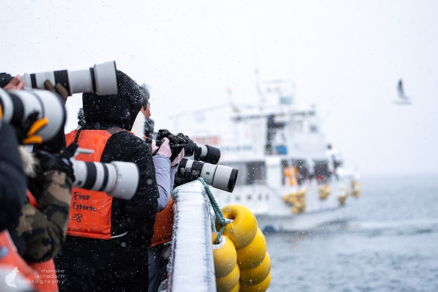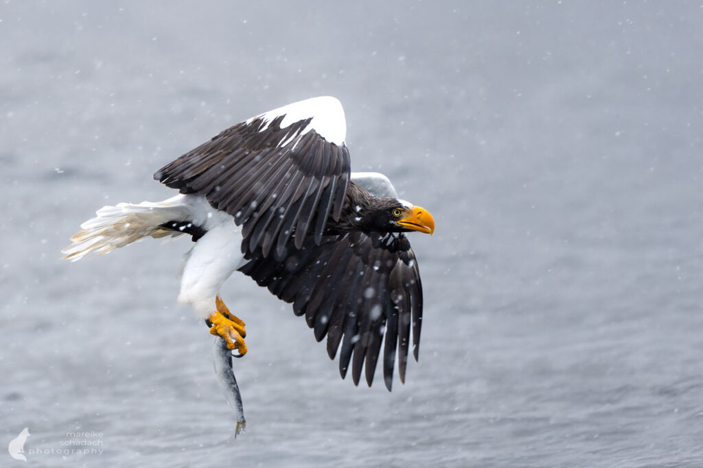 Early in the morning, the port of Rausu still lies sleepy beneath its blanket of snow. Only a few birdwatchers, bundled up warmly, gather in front of the tour boat to see the white-tailed eagles. We don’t have to go far to see them. Already perched on the outer wall of the harbor, several Steller’s sea eagles and white-tailed sea eagles watch our boat as it departs. They’re getting ready for breakfast. Lured by the fish, dozens of eagles soon circle above our ship, diving down and snatching one fish after another with their powerful talons.