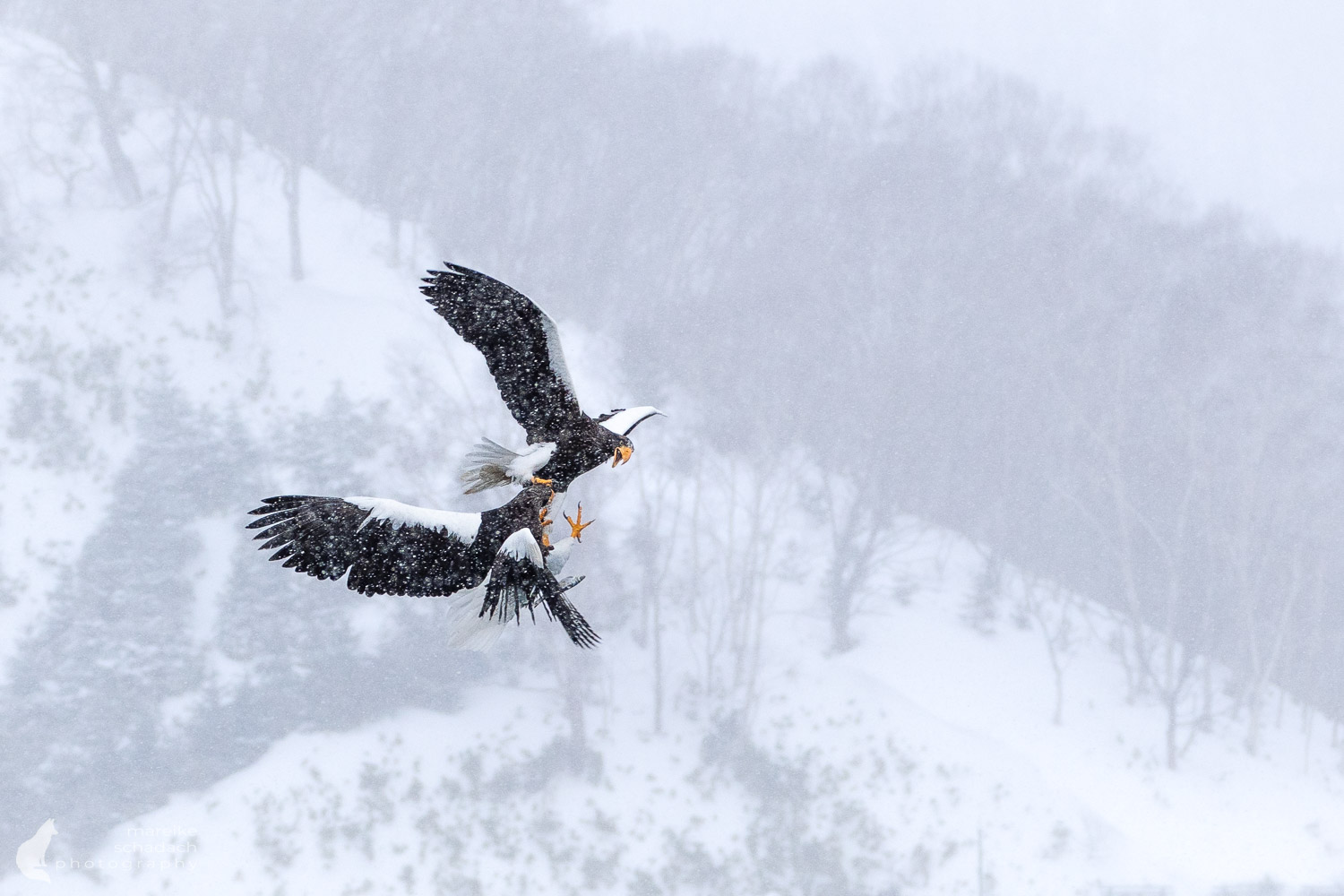 The journey continues to the Shiretoko Peninsula in northeastern Hokkaido. The mountains and coastlines here are part of one of Japan’s wildest regions and attract hikers with their pristine forests, waterfalls, and sweeping views of the Sea of Okhotsk. At the same time, the area is home to many Ussuri brown bears. Hikers are therefore advised to wear bear bells, store food securely, and check for recent sightings and safety guidelines before setting out on a hike. Even in winter, encounters can occur, as not all bears hibernate continuously here. However, it is far more likely to encounter one of the kings of the skies here in winter: the Steller’s sea eagle.
