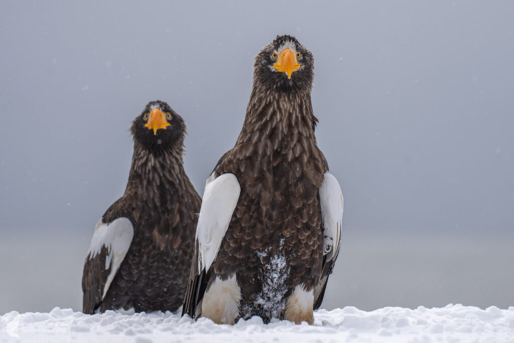 In winter, unusually large numbers of Steller’s sea eagles (Haliaeetus pelagicus) and white-tailed sea eagles (Haliaeetus albicilla)gather along the coast of Hokkaido. Steller’s sea eagles breed in the summer primarily along the coasts of Eastern Siberia, particularly in Kamchatka and the Kuril Islands, and migrate south to Hokkaido in the winter, where the sea does not become covered in drift ice until mid-February. According to estimates, several thousand individuals spend the winter in Hokkaido—nearly a third of the global population. Many Steller’s sea eagles, which have a vast breeding range stretching from Scandinavia to the Far East, also overwinter in Hokkaido. Both species benefit from the abundant fish stocks around the Shiretoko Peninsula, making the area one of the world’s best spots for observing sea eagles. You’ll easily spot them by scanning the tall trees along the coast or simply gazing up at the sky for a while. The best spots for spotting them are around Utoro, Rausu, on the Notsuke Peninsula, as well as near Lake Furen and Nemuro..