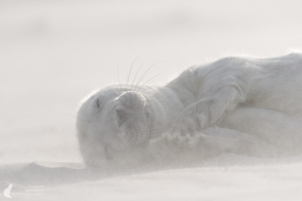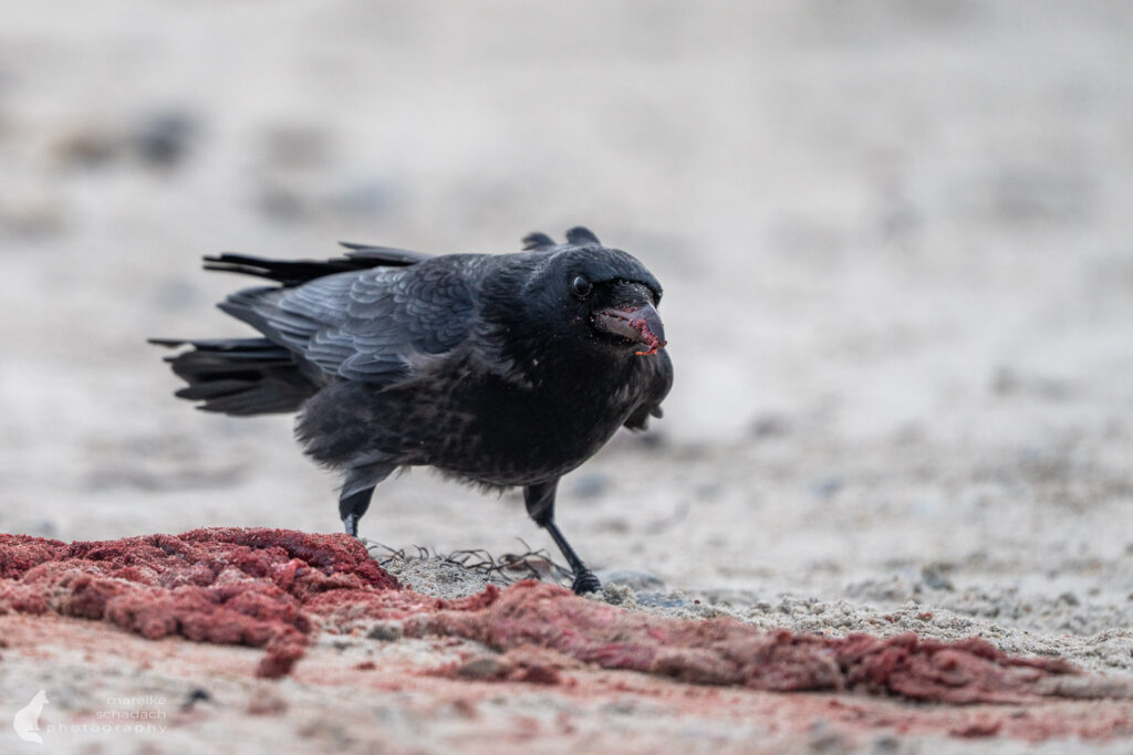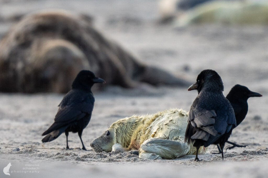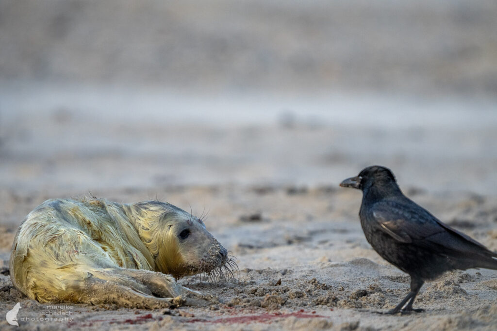 Das kleine Robbenbaby öffnet sofort die Augen und wird von seiner Mutter beschnuppert und berührt. Momente der Nähe, einfach schön anzusehen. Währenddessen drängeln sich die Krähen vor dem Mutterkuchen, bevor dieser abkühlt und mit Sand bedeckt wird. Ein wildes Fressen beginnt. Das Kalb schaut mit seinen großen schwarzen Augen etwas irritiert in die Welt. Ob es die Krähe direkt vor sich schon scharf erkennen kann? Sieht es uns Fotografen? Seine ersten Bewegungen wirken zittrig, tastend. Es dauert eine Weile, bis das Kleine die Milchzitzen gefunden hat und sein Fell trocken ist. Nun ist es nicht mehr gelblich, sondern zeigt sein schönes, weißes Lanugo-Fell. An seinem Bauch hängt noch ein Stück der frischen Nabelschnur.