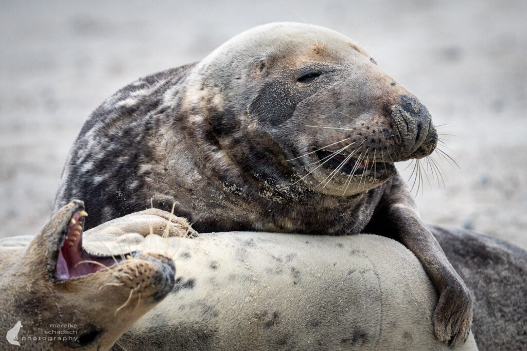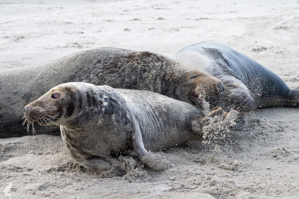 Die Kegelrobben liegen oft dicht an dicht. Daher sind die Strände für Menschen gesperrt. Ein Strandspaziergang, ohne die Robben zu stören oder einen Biss zu riskieren, ist dann nicht mehr möglich. Beobachten kann man die Tiere trotzdem: