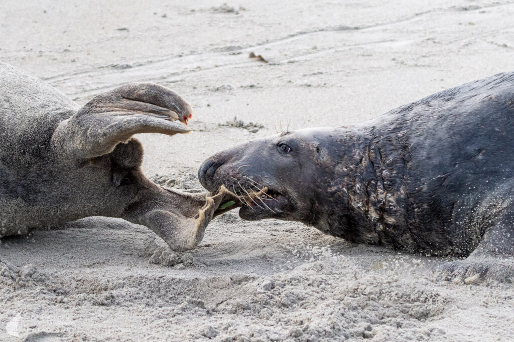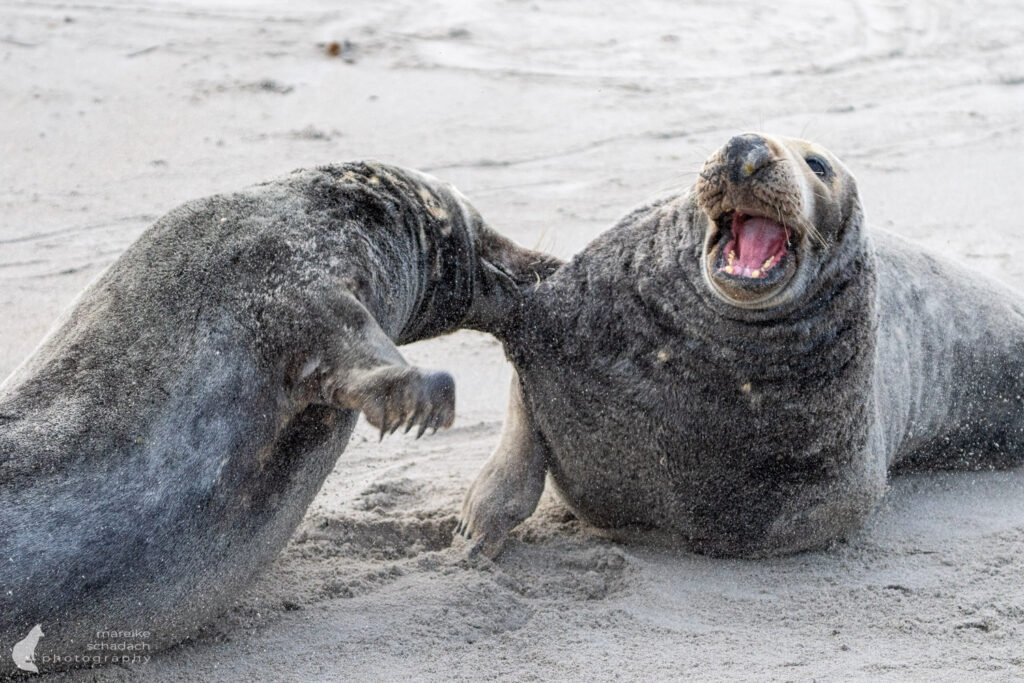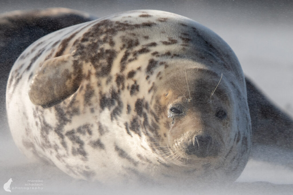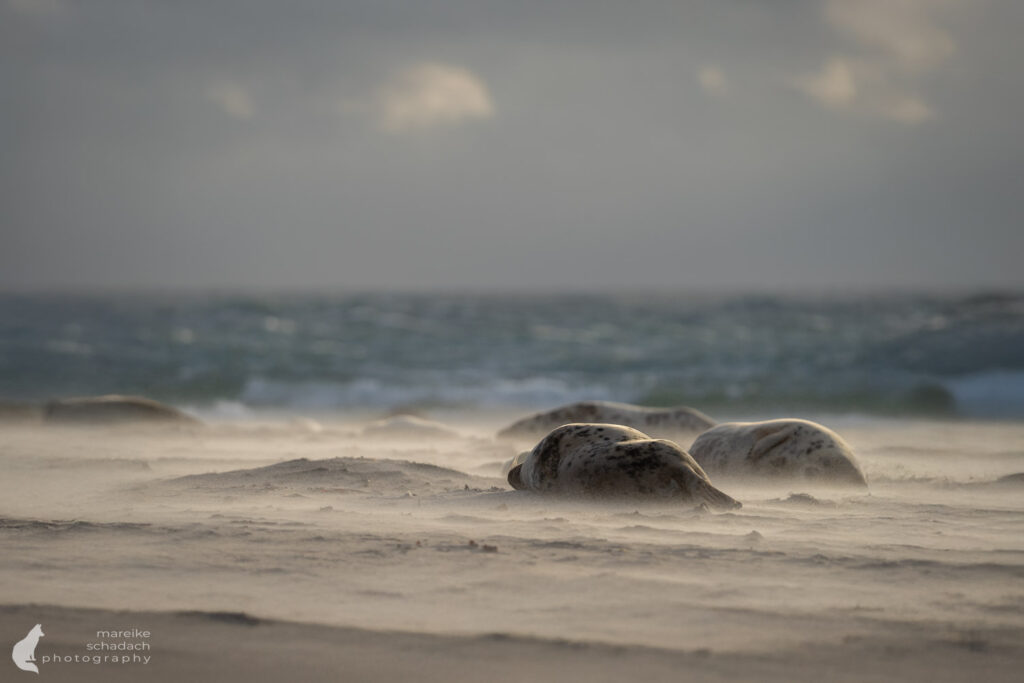 Der Wind hat die Helgoland-Düne fest im Griff. Feiner Sand peitscht über den Strand, zeichnet helle Schleier über den Boden. Die Sandkörner treffen mich wie kleine Nadeln und knirschen zwischen meinen Zähnen. Ich bin froh über meine Schutzbrille aus dem Baumarkt, durch die ich meine Augen entspannt offen halten kann. Mein Blick und meine Kamera sind fest auf eine dicke Kegelrobbe gerichtet, die sich nicht weit entfernt vom Absperrzaun auffällig nervös verhält. Nach einigen Minuten im Sandpeeling wird mein Verdacht bestätigt: An ihrem Hinterleib zeigt sich eine prall gefüllte, rote Fruchtblase.