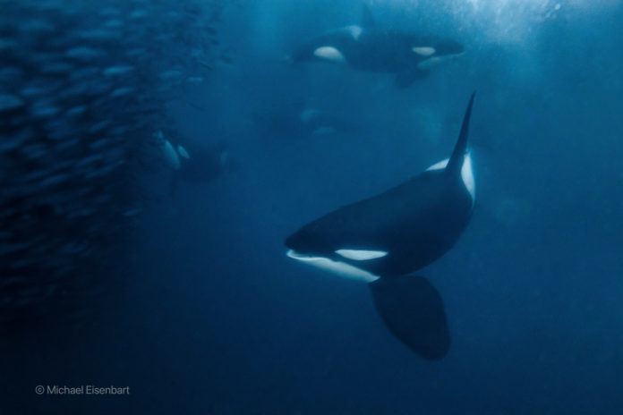 Zuerst höre ich sie. Dann sehe ich ihre weißen Bäuche und die Augenflecken unter Wasser aufleuchten. Langsam nehmen die Orcas Gestalt an und mit einem Mal sehe ich auch den Bait Ball neben mir. Dann werden es immer mehr Orcas. Sie sind überall: neben mir, unter mir und manche stecken mitten im Bait Ball. Während einige Orcas den Bait Ball umkreisten, wirbeln andere herum, schwimmen einen Looping und schlagen mit ihrer Schwanzflosse kraftvoll auf die Fische. Anschließend fressen sie die toten Heringe. Einen nach dem anderen. Direkt neben mir.
